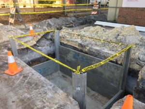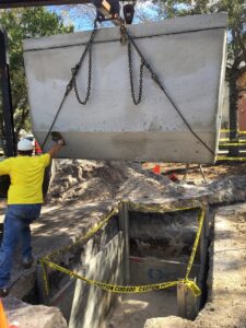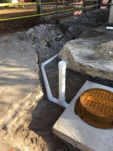 This client’s existing grease trap failed but it was in a location where that we couldn’t reach with our equipment. Because of this issue, we relocated the tank about 70 feet from its original location, which allowed us the access we needed. We dug the trench large enough to accommodate the new tank. Our truck brought a 1,200-gallon concrete, a tractor-graded tank that weighed approximately 15,000 pounds and lowered it into place. We reconnected the inlet and outlet piping and, after the inspection, we backfilled the trench and paved the area. As part of this process, a mini manhole cover was installed on the pavement to make it easier to clean out the tank as needed.