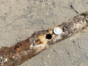 The water service that feeds a Regent’s Bank in Largo was failing and we were contacted to address the issue. We removed the asphalt that covered the waterline and found that a quarter-sized hole in a length of galvanized pipe. We removed this section and replaced it with a plastic pipe. Sometimes this type of repair can last for years but in most situations, it is best to replace the entire line. The reason we might recommend full replacement is that the rust and corrosion in the pipe can contaminate the water coming into a home or building, and sometimes when we cut the faulty section out vibrations from the saw can cause other leaks. Galvanized pipes are no longer in common use and when leaks and other problems arise it usually means that they have reached the end of its viability.